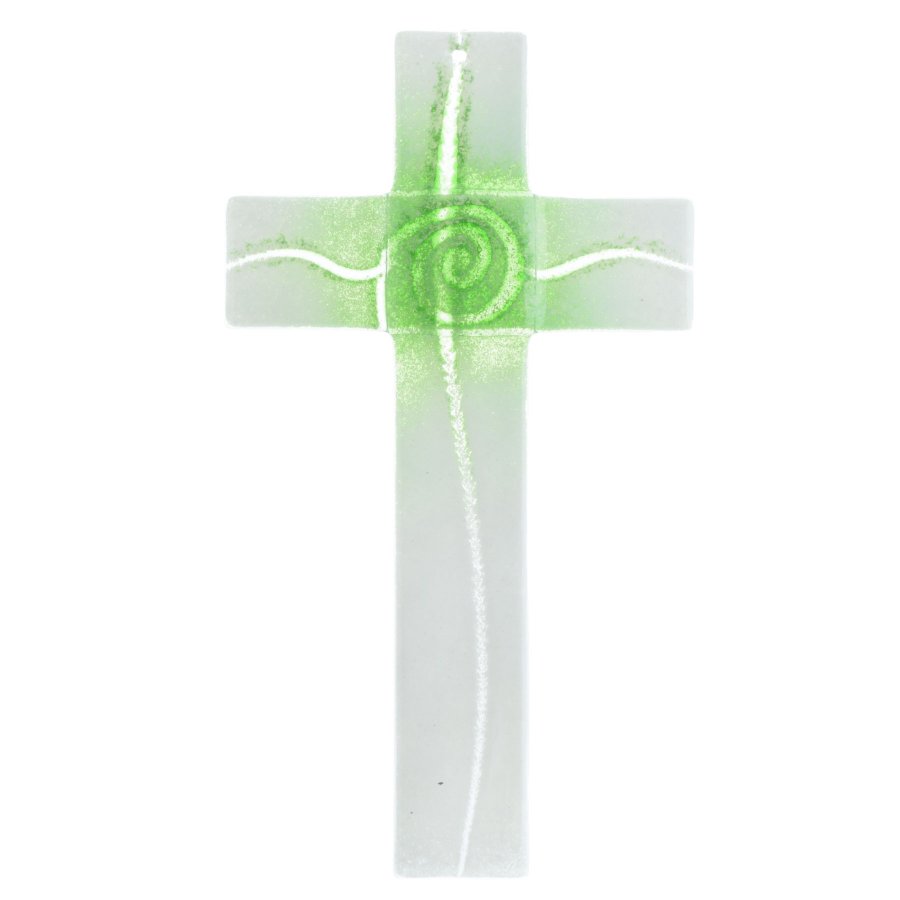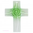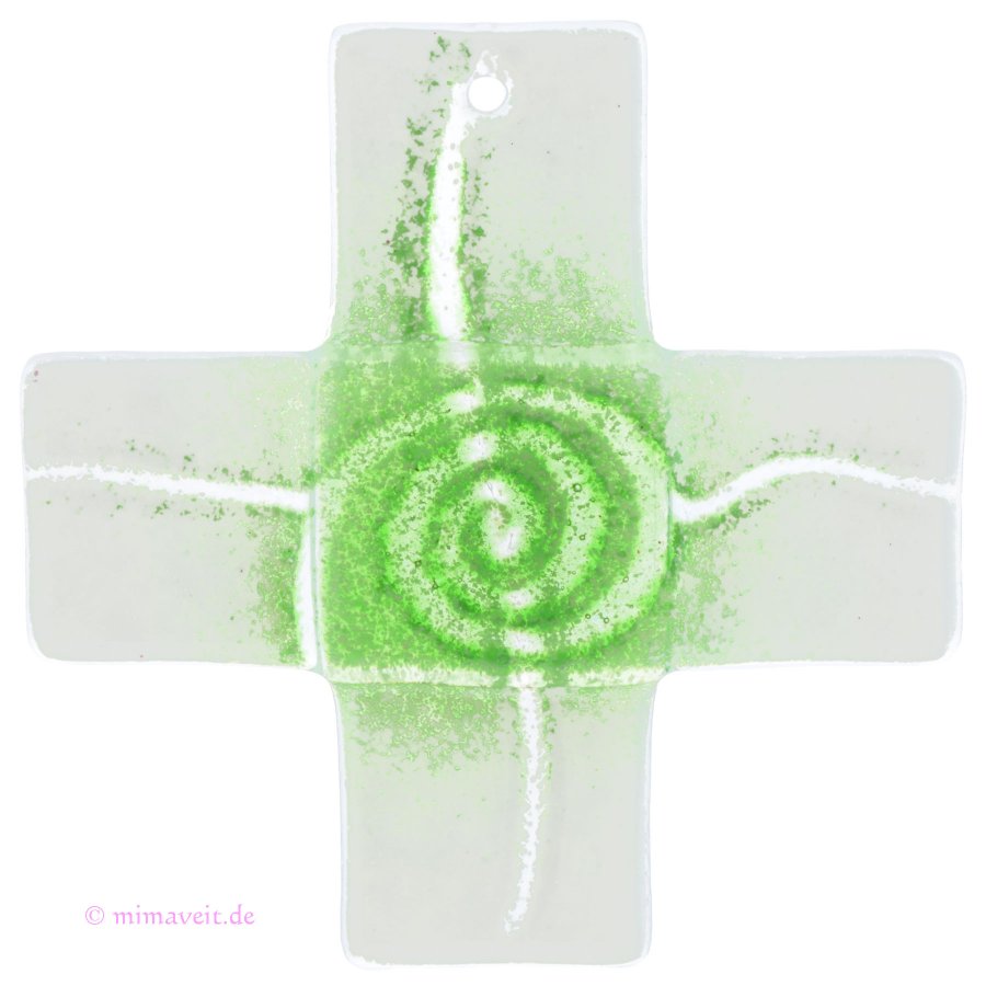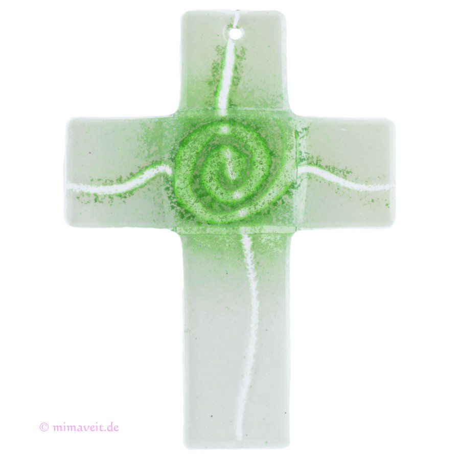 Glaskreuz Kreuz aus Glas Wandkreuz Spirale chromgrün weißopal