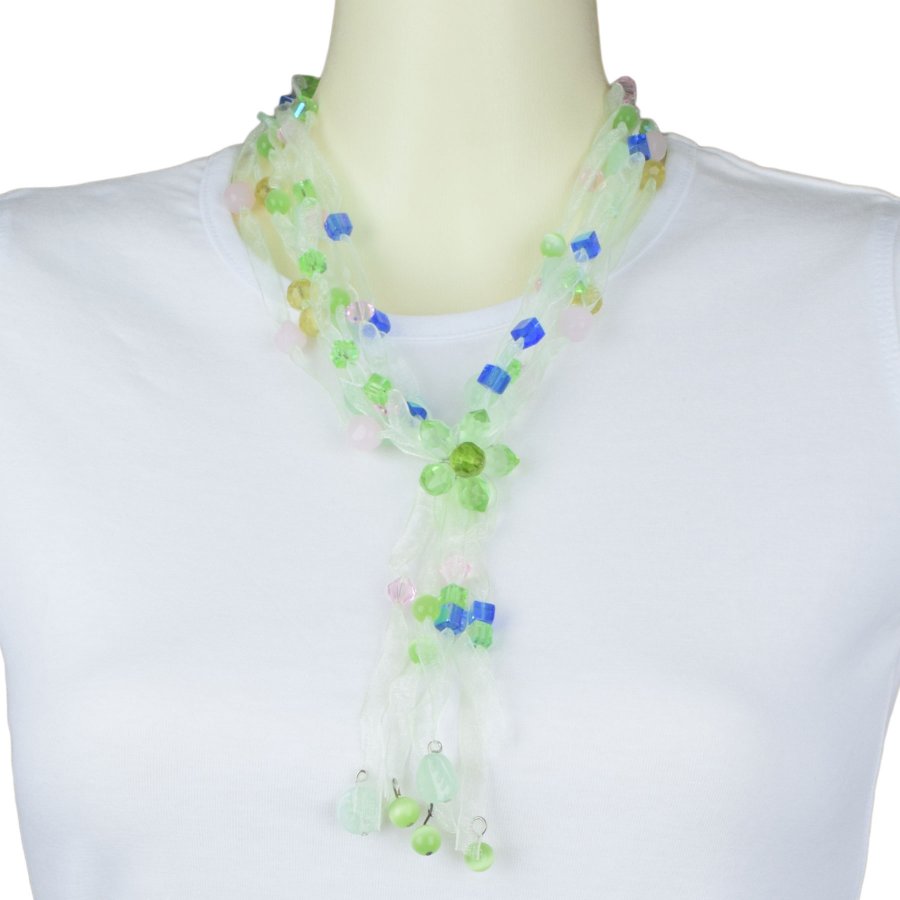 Die Kette besteht aus 7 zusammengefassten Organzabändern bestückt mit verschiedenfarbigen Perlen und einer grünen Blüte.