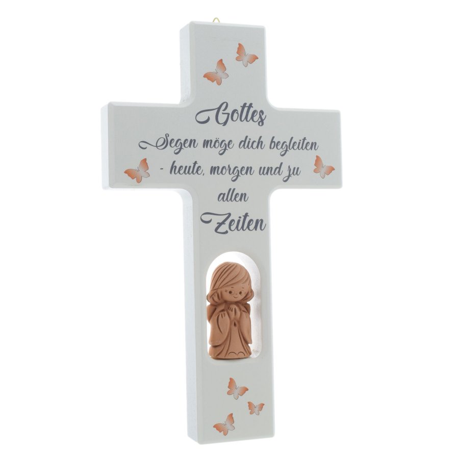 Holzkreuz mit handgearbeitetem Schutzengel aus Ton.