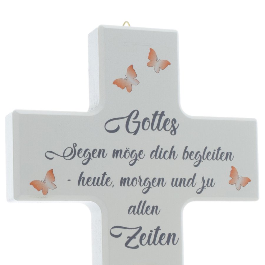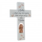 Aus Ahornholz gefertigtes Kreuz für Kinder mit Schmetterlingen bzw. Blümchen, die z. T. mit glitzernden Kristallen verziert sind.