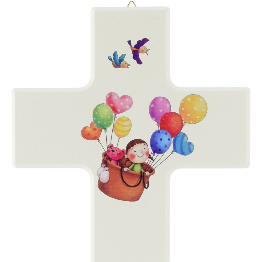 Aus Ahornholz gefertigtes Kreuz für Kinder mit ansprechenden farbigen Bildern: Ein Kind sitzt mit seinem Teddy in einem Korb, der von bunten Luftballons in den Himmel hoch getragen wird.