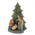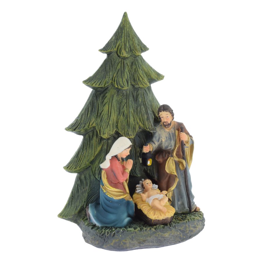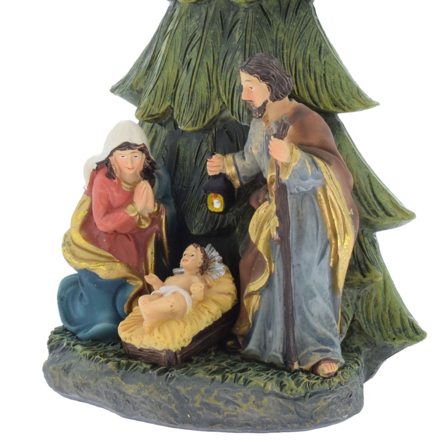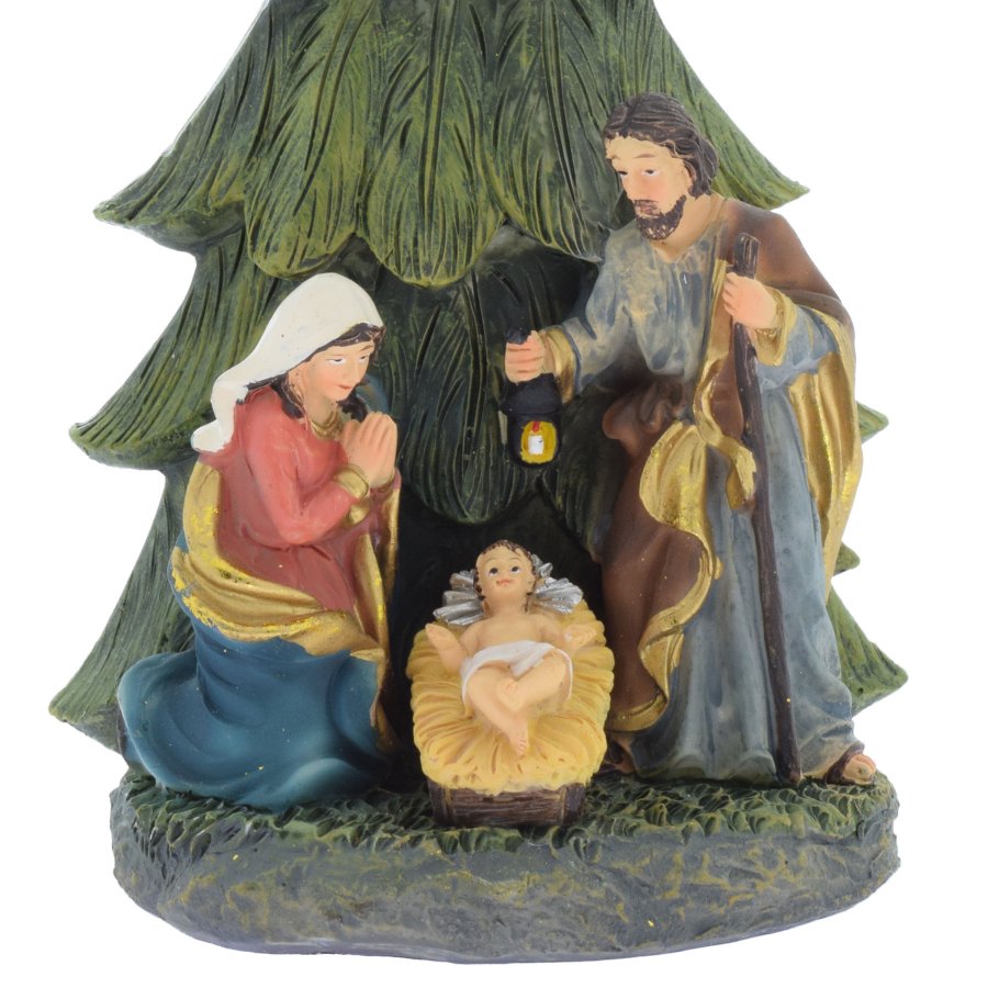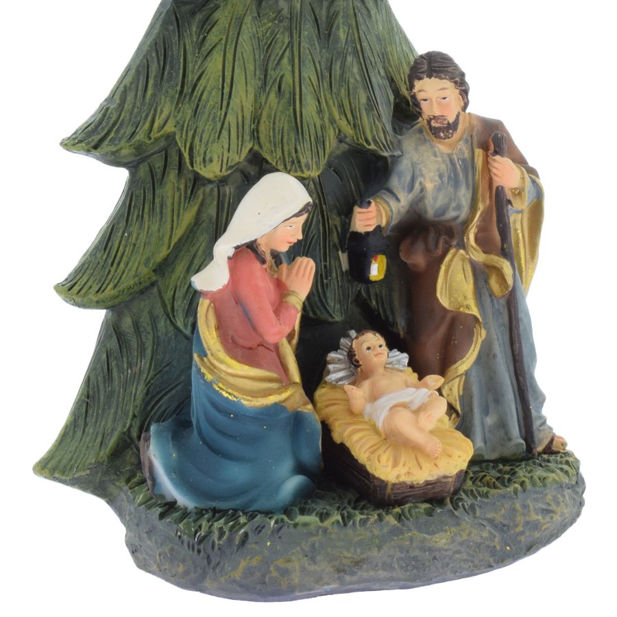 Wunderschöne Blockkrippe mit der Heiligen Familie unter einem Tannenbaum.